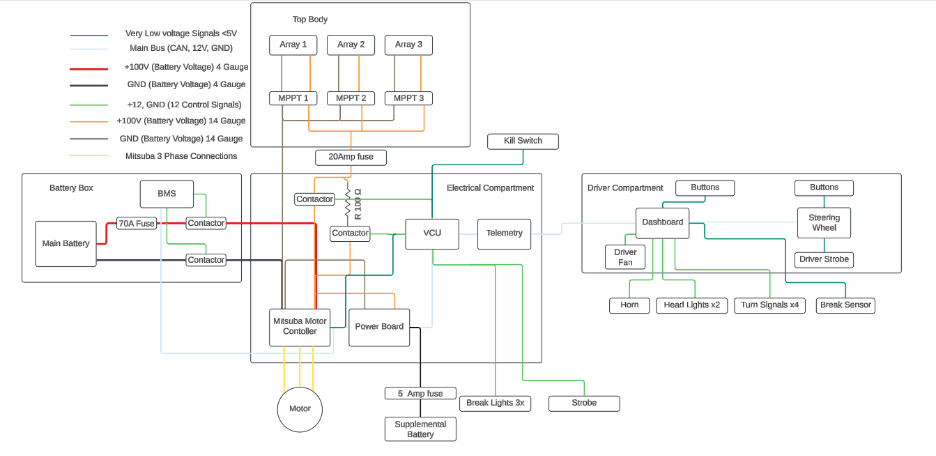 As the Electrical Chief Engineer for the UF Solar Car Team it was my responsibility to dictate the electrical Architecture for our Fourth Car (Flare). This was based greatly from what I learned contributing to our third car (sun rider) and from the many amazing team alumni.