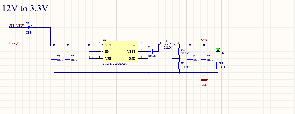 The next step a standard buck converter design based around a TI controller chip with integrated FET, the proper output capacitor and inductor are selected, along with a voltage divider for feedback and an LED for power status. On the input side, are Input capacitors and a diode allowing for the board to be powered off the USB port. While the diode is quite inefficient (something like a power mux might be better) we only care about the efficiently from the 12V supply as this is all that is used while racing.