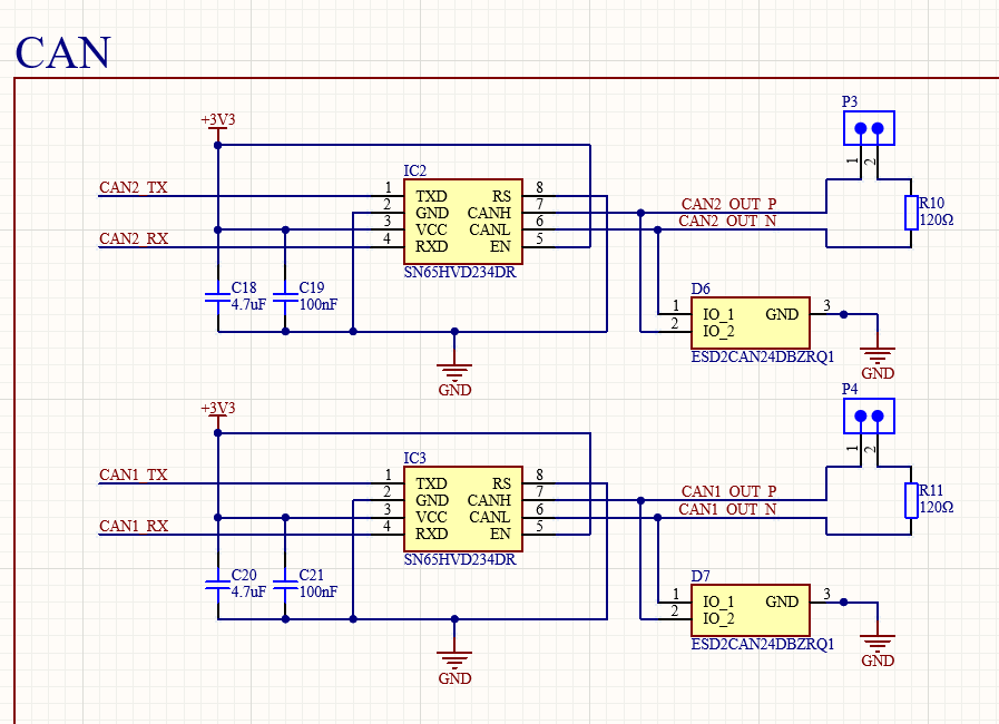 Each board on our car has two independent CAN transceivers allowing for a Dual CAN bus system. this is done for reliability. Each Transceiver is paired with two decoupling capacitors, a TVS diode, and a 120 ohm termination resistor, configurable with a jumper.