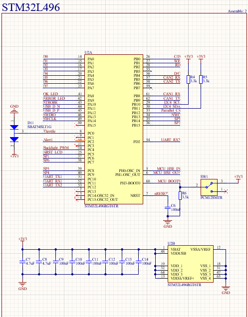 This board uses a STM32L496R microcontroller. Shown above is the STM32 Circuity used on the Dashboard of the Car. For each power pin a 100nF decoupling capacitor is used, and two large 4.7uF caps are used for bulk decoupling