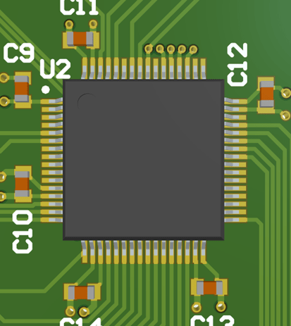 In this photo you can see the layout and routing of the decoupling capacitors as you can see each decoupling capacitor is places across a pair of +3.3V and GND pins and is placed between the pins and vias which connect to the GND and +3.3V layers.