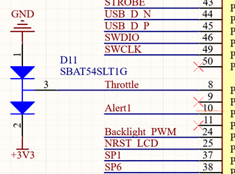 The throttle connects directly from one of the connectors to one of the internal ADCs on the micro controller. In order to protect the micro controller from Electrostatic discharge a diode array is used on the node. A current limiting resistor should also be used.