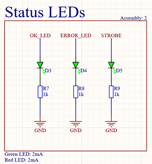 Three status LEDs are also on the MCU schematic, along with the proper current limiting resistors
