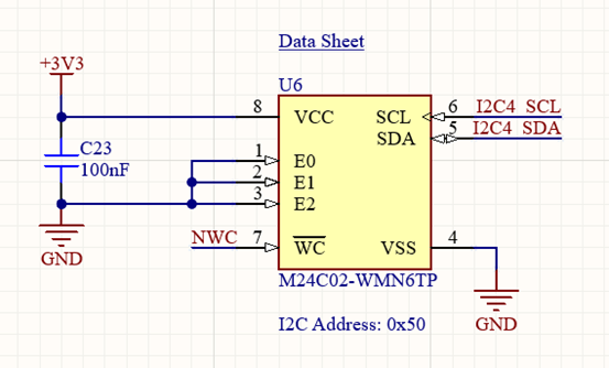 The next feature is a I2C addressable EEPROM chip, this allows for Non-Volatile Memory (Memory which lasts between power cycles). The only non-volatile memory built into the STM32 is the flash memory which is used for storing program code. (In theory you might be able to use any spare flash memory for storing whatever you want but its not recommended). The EEPROM simply requires a I2C connection, and a GPIO connection for read write protection, and a 100nF decoupling capacitor.