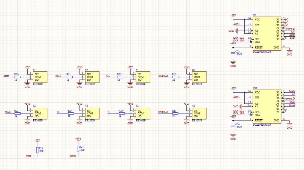 The dashboard was also responsible for monitoring a number of digital inputs, in the form of 8 board mounted buttons, the brake peddle sensor, and the ignition switch. Again using GPIO expanders.